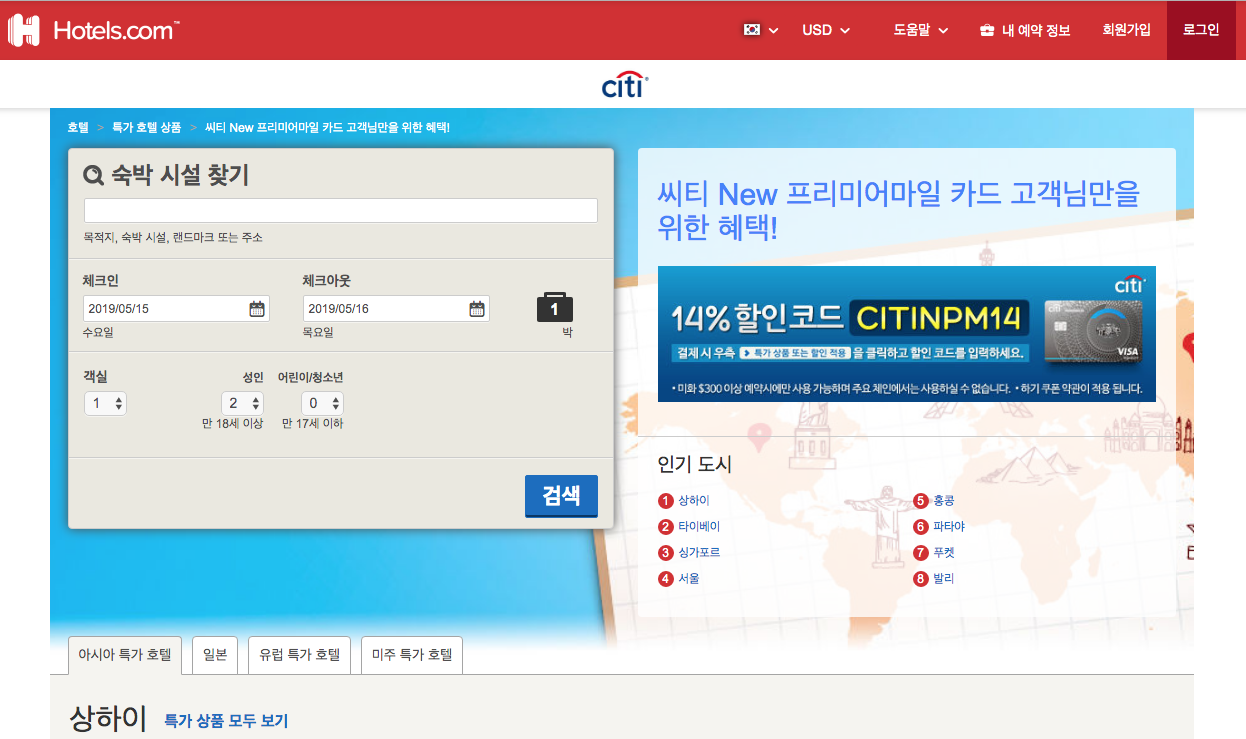 위에 링크를 따라가면 호텔스닷컴 씨티카드 제휴 페이지가 나오는데 오른쪽에 보이는 할인코드를 입력 후 해당 카드로 결제하면 14%가 그냥 할인된다는 것이죠.