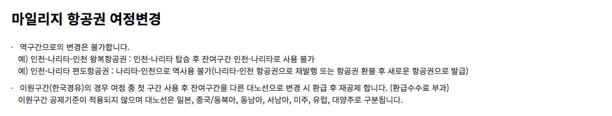 참고로 마일리지 항공 여정변경시에 국내선은 수수료가 없고, 국제선은 30달러 혹은 3,000마일이에요. 대신 역 구간(반대여정)으로의 변경은 불가하다는 거 기억해두시면 될 것 같아요. 이상 아시아나 마일리지 항공권 취소수수료에 대해 알아봤습니다.