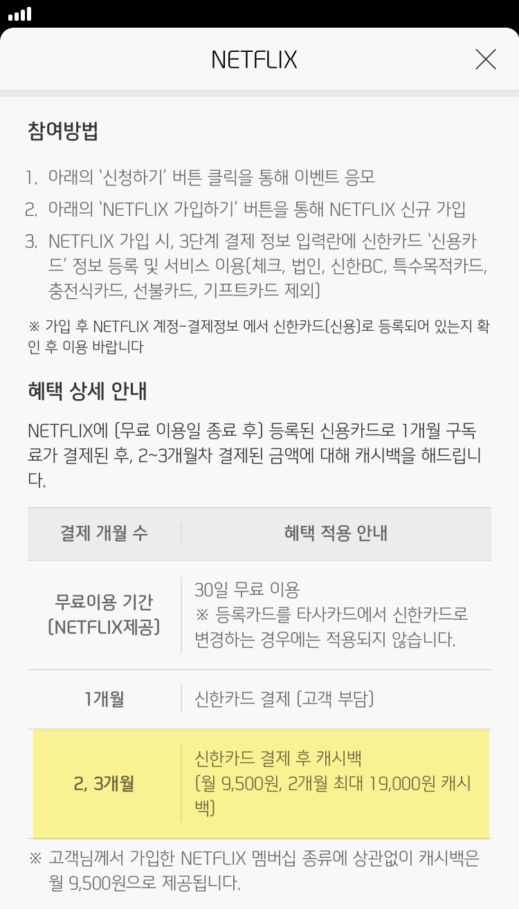 첫째 달은 넷플릭스가 제공하는 무료, 두 번째 달은 신한카드 결제, 세 번째/네 번째 달은 신한카드 결제 후 캐시백(월 9,500원씩)이 됩니다.