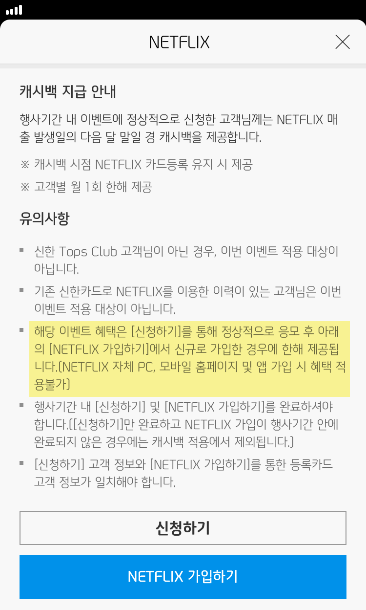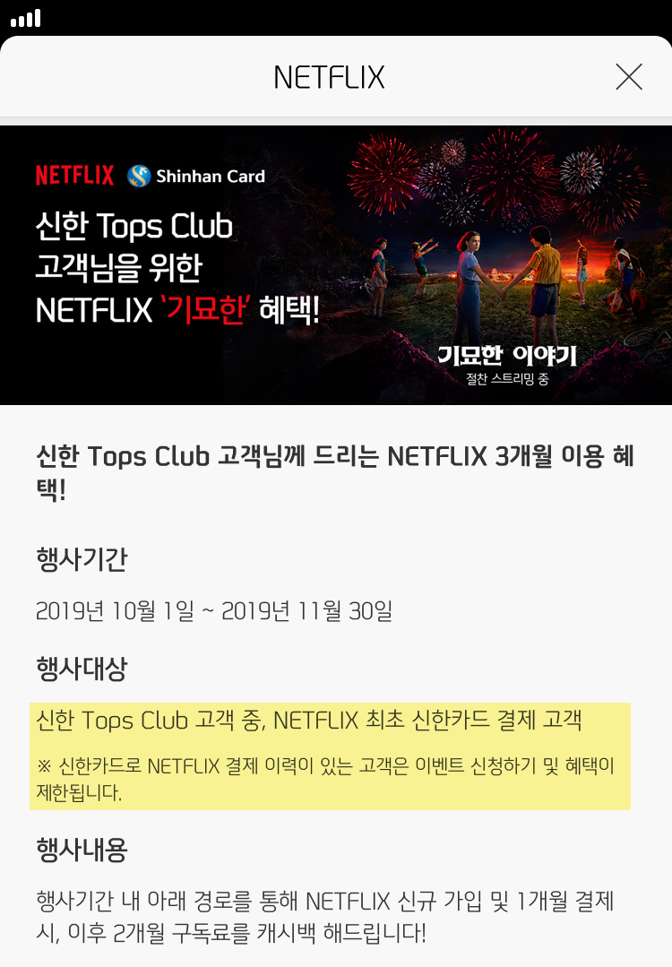 이전에 신한카드로 넷플릭스 결제 이력이 있는 고객은 혜택을 못 받습니다.