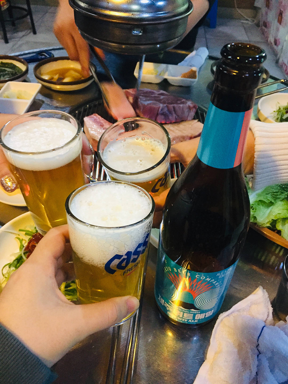 숙소에 오기전에 표선수산마트에 들려서 고등어회와 방어회, 처음 먹어보는 부시리를 포장해왔다. 짐을 풀고 가까운 편의점에서 맥주랑 과자랑 사 가지고 와서 회 파티~ ㅋㅋㅋ 사실 회를 못 먹는 친구가 있어서 회는 삼겹살을 먹기 전 애피타이저로 간단하게 먹었다. 남겨놨다 나중에 먹으려던 회는 안타깝게도 색이 변해서 상했을지 몰라서 다 버려야만 했지만... 이날 맛 본 회는 역시나 꿀맛! 한 달에 한 번씩 가서 먹고 싶다. 제주도에 오면 꼭 먹는 흑돼지 삼겹살은 칠돈가 본점에서 먹었다. 웨이팅이 길었지만 그만큼 맛있었던 고기는 제주 위트 에일 맥주와 함께 먹어서 더더 맛이 좋았다.