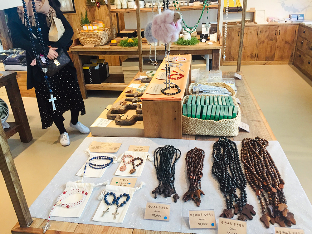 이런 곳에 오면 꼭 뭐 하나 사고 싶어 진다. 그러나 난 종교가 없고 부모님은 불교를 믿으시기 때문에 내 걸로 뭔가를 사기는 좀 그렇다. 그래서 가까운 친구 중에서 성당을 다니는 친구에게 선물하기로 했다. 마음에 꼭 들었으면 좋겠다는 마음을 담아 고심 끝에 파란 돌(돌 이름이 생각이 안 나서.. 그냥 파란 돌) 팔찌를 골랐다.