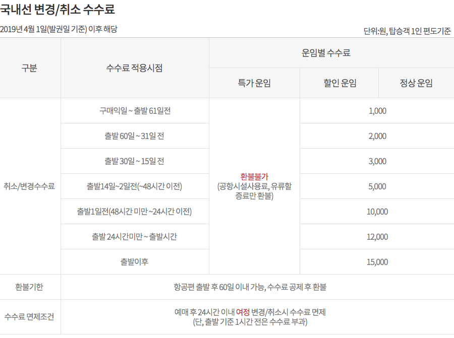 국내선 취소 수수료는 비교적 간단합니다. 특가운임의 경우에는 환불이 불가능(공항이용료, 유류할증료만 환불)하고, 할인/정상운임은 구매익일부터 시간에따라 1,000원에서 15,000원까지 부과됩니다. 수수료가 면제되는 조건은 예매 후 24시간 이내입니다. (단, 출발 기준 1시간 전이면 수수료 부과)