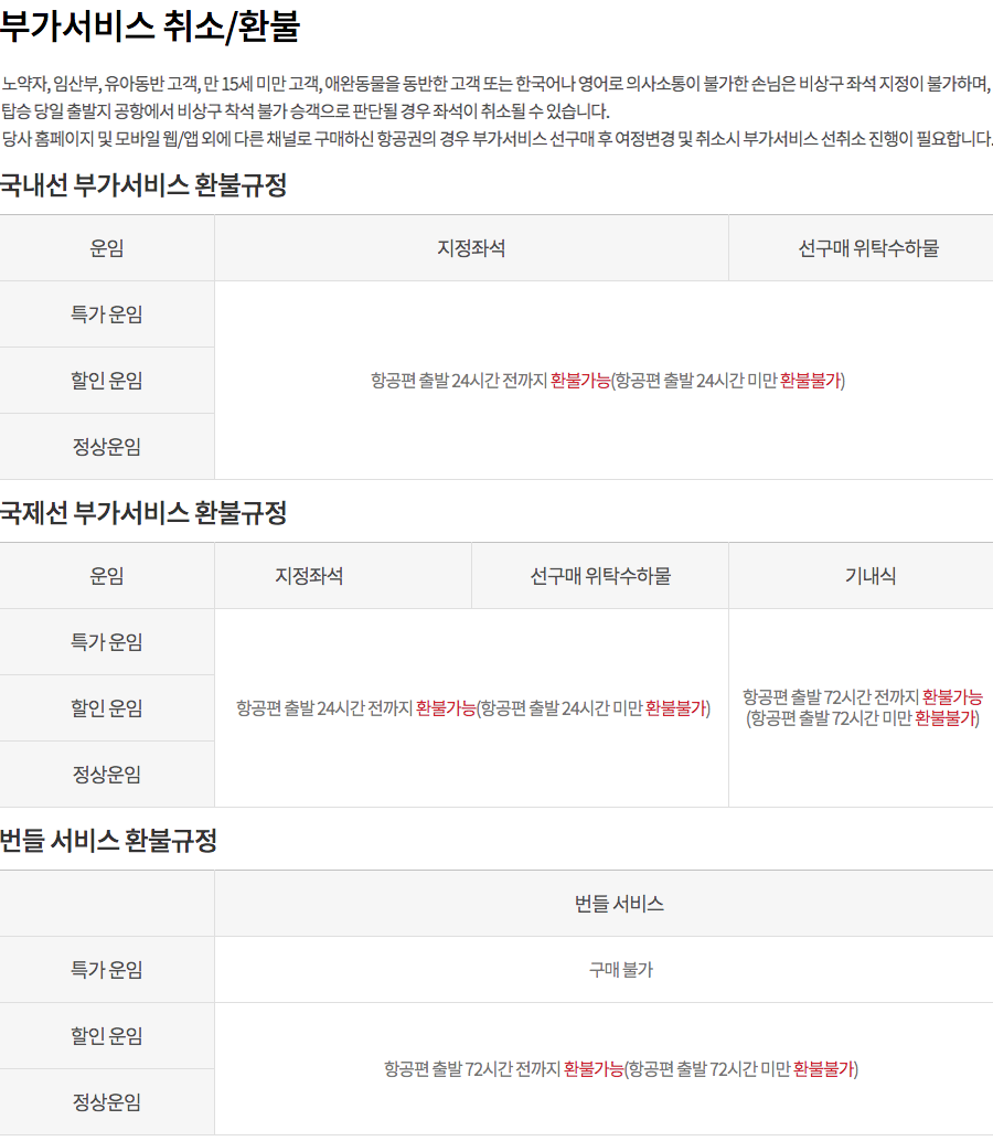 저가항공은 부가서비스를 추가결제해야하는 경우가 많은데 이 부과서비스에는 항공권과 별개로 규정이 있습니다. 지정좌석, 선구매 위탁수하물 서비스는 국내선/국제선 모두 항공편 출발 24시간 전까지 환불이 가능하고 기내식(국제선)과 번들 서비스는 출발 72시간 전까지만 환불이 가능한 점 알아두세요.