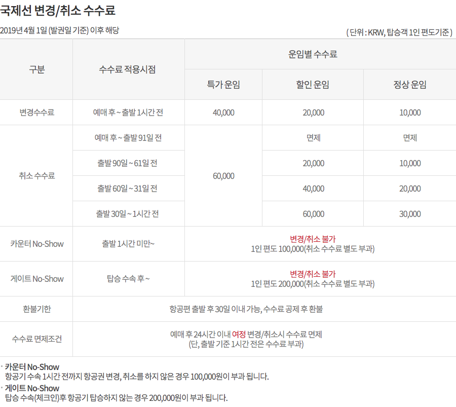 국제선은 노쇼(No-Show: 취소/변경없이 나타나지 않는 경우)에 추가 수수료도 부과하는데요. 카운터 노쇼는 편도기준 10만원, 게이트 노쇼는 20만원으로 적지않은 돈이니 꼭 사전에 조치하시기 바랍니다. 예매 후 24시간 이내 변경/취소시 수수료 면제는 국내선과 동일합니다.