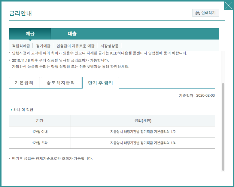 만기 후에는 지급당시 해당 기간별 정기적금 기본금리의 2분의 1~4분의 1 만큼 받을 수 있다고 합니다.