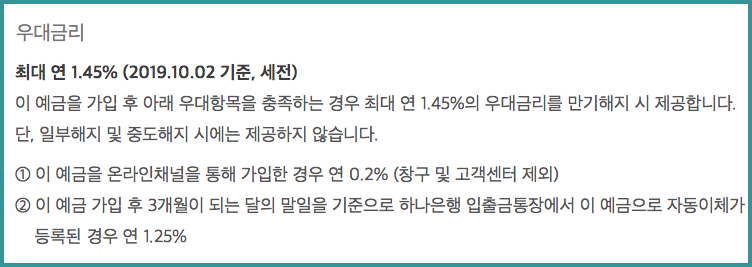 가장 궁금한 금리인데요. 일단 기본 금리가 3.56%입니다. 여기에 우대금리가 최대 연 1.45%인데 두 가지 조건이 있습니다. 첫 번째는 온라인 채널을 통해 가입하는 경우 추가 0.2%이고 두 번째는 가입 후 3개월이 되는 달의 말일을 기준으로 하나은행 입출금통장에서 이 예금으로 자동이체가 등록된 경우 1.25%를 우대해줍니다. 이렇게 우대금리가 모두 적용됐을 때 하나더적금의 1년 만기 금리 5.01%가 됩니다. 물론 중도해지하거나 만기 후에는 금리가 변동됩니다.