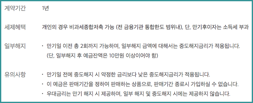 개인의 경우 비과세종합저축으로 가입이 가능하지만 만기 후 이자는 소득세를 부과합니다. 일부 해지도 가능합니다. 만기일 이전 총 2회까지 일부 해지할 수 있고 일부 해지 금액에 대해서는 중도해지 금리가 적용됩니다. (단, 일부 해지 후 예금잔액은 10만 원 이상이어야 함) 이 모든 혜택은 만기 해지 시에 제공된다는 점 기억해 두시고 보다 자세한 내용은 아래 상품 리플릿(출처: 하나은행 홈페이지)을 참고하세요.