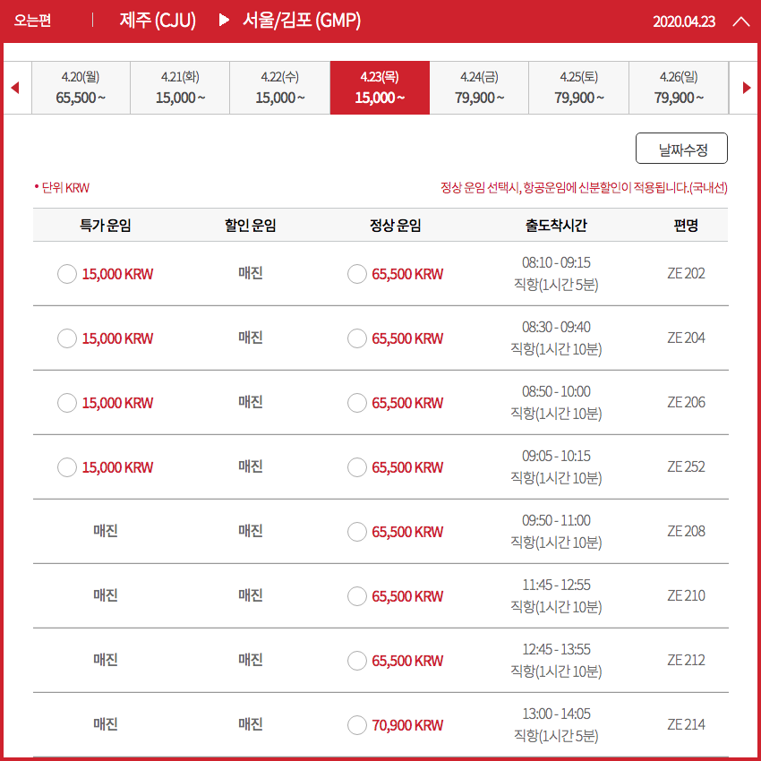 이스타항공입니다. 4천원부터 특가운임이 형성되어있어요. 지금기준으로 봤을때 이번주 토요일에도 4,000원 항공권이 보이네요. 주말 제주도 항공권이 4,000원... 믿어지지가 않습니다.
