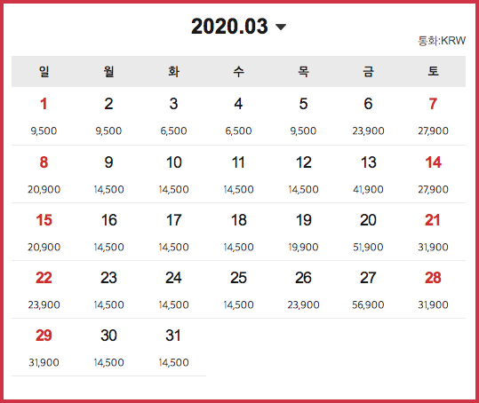 3000원 특가의 주인공은 티웨이항공입니다. 보시는 것 처럼 3,000원 특가날짜는 2월 12일 하루지만 만원 미만의 특가 날짜는 꽤 많아 보입니다. 여기에 유류할증료 5,500원(변동있음), 공항이용료 4,000원을 더해도 편도 2만원, 왕복 5만원이 안되니까 정말 혹하는 값이 아닐 수 없습니다. 당일치기로 갔다올까 하는 마음도 생기네요.