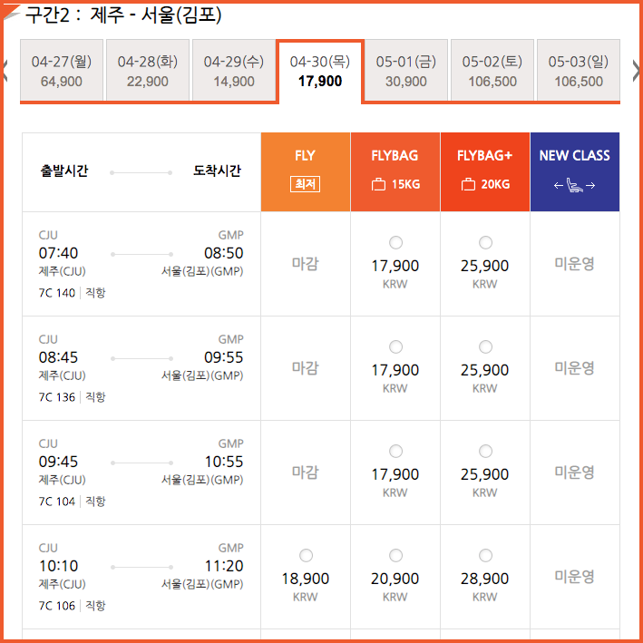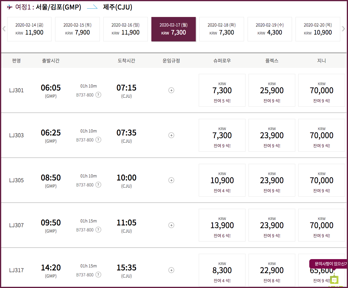진에어는 최저가 4,300원이 보이네요. 전체적으로 만원대의 슈퍼로우 요금대가 잔여석도 아직은 많습니다.(포스팅하는 지금도 실시간 줄어들고 있겠지만요)