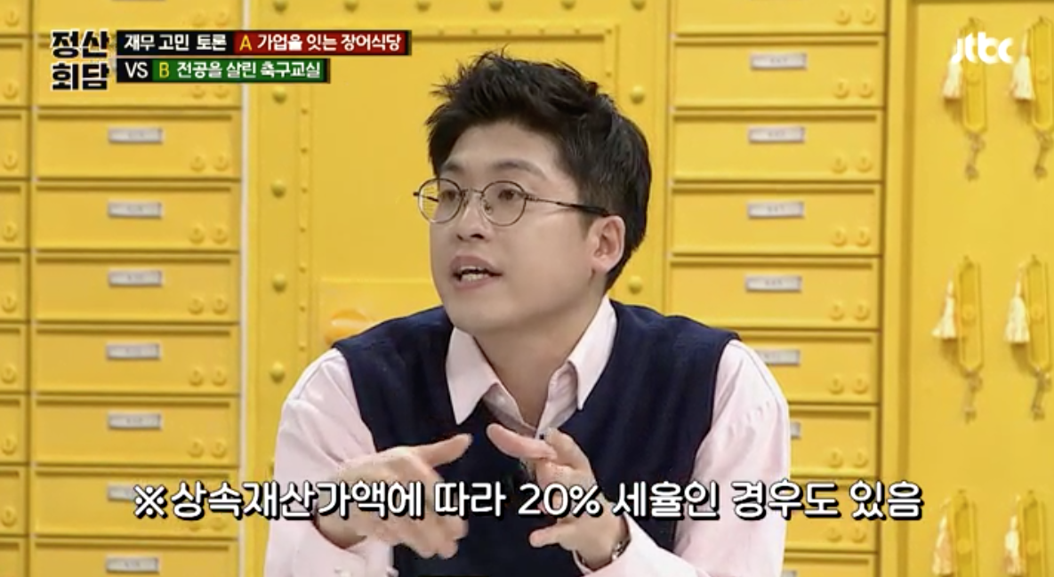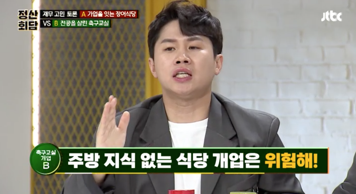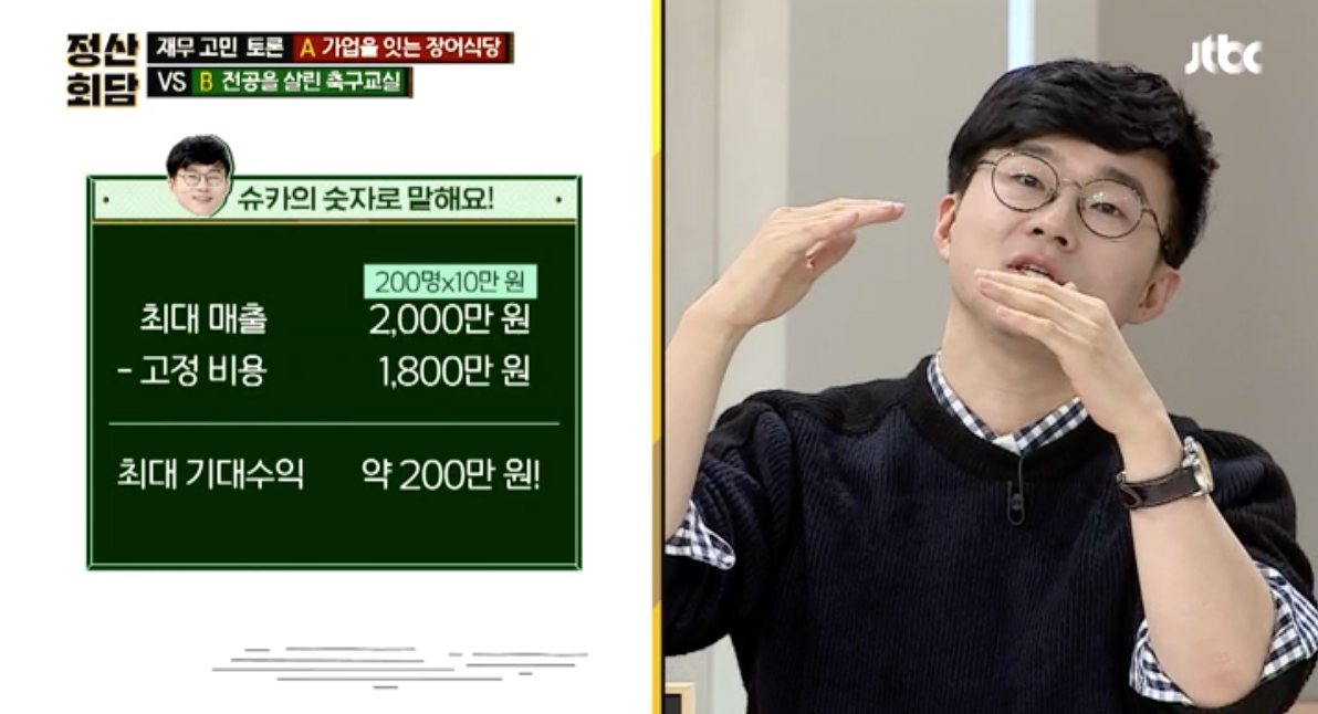 의뢰인은 가업을 승계받아서 장어집을 개업할지 자신의 전공을 살려서 축구교실을 개업할지가 고민인데요. 장어집 개업을 반대하는 양세형씨 의견은 주방 지식이 없는 사람이 식당 개업을 하는 것은 위험하다는 것이고 축구교실을 반대하는 슈카씨의 의견은 수익과 위험으로 따져 봤을 때 최대 기대수익이 약 200만원 정도밖에 되지 않는다고 보는 것입니다.