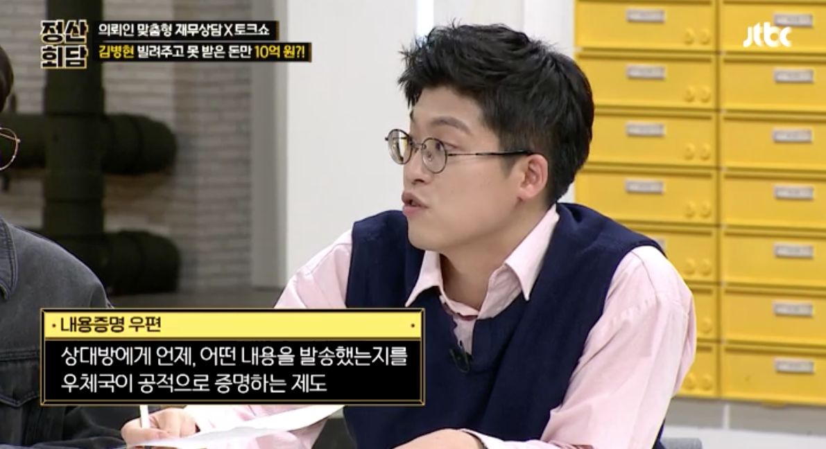차용증이란 돈을 빌려줄 때 "나는 OO에게 O월 O일에 얼마를 빌려줬고 O월 O일까지 갚기로 했다. 이자는 O%로 한다..."등의 내용을 적고 싸인을 한 증서인데요. 돈을 빌려주면서 차용증을 안 쓰거나 빌려준 돈을 제때 받지 못하는 경우가 종종 있습니다. 차용증을 반드시 쓰는 게 좋겠지만 차용증이 없더라고 방법이 아주 없는 것은 아니라고 해요. 이 방송에서 그 방법에 대한 자세한 내용은 들을 수 없었지만 찾아보면 이체내역이나 통화한 내역, 문자내역 등이 있으면 방법이 없지 않다는 거..