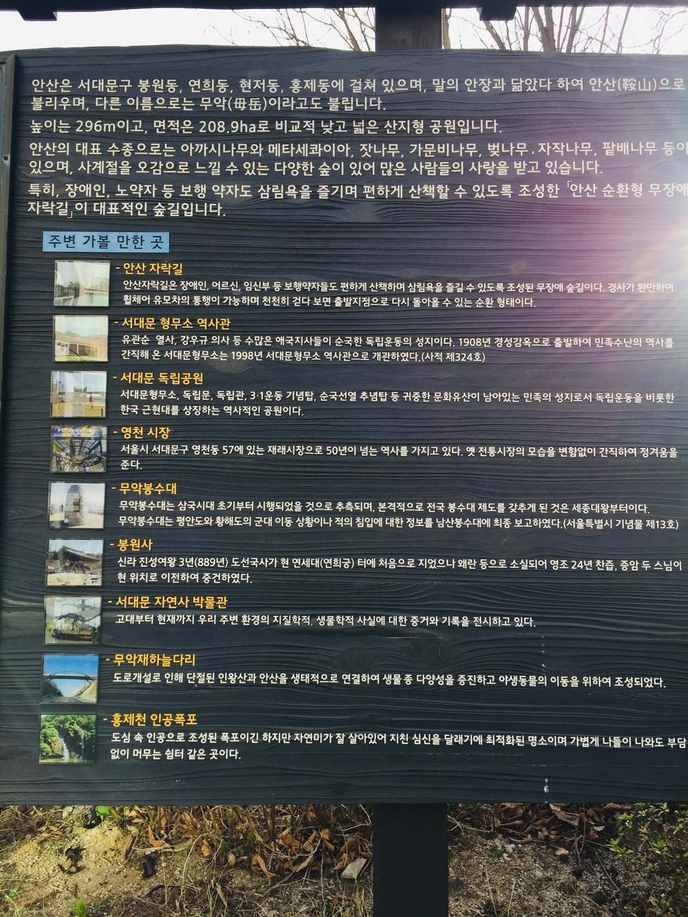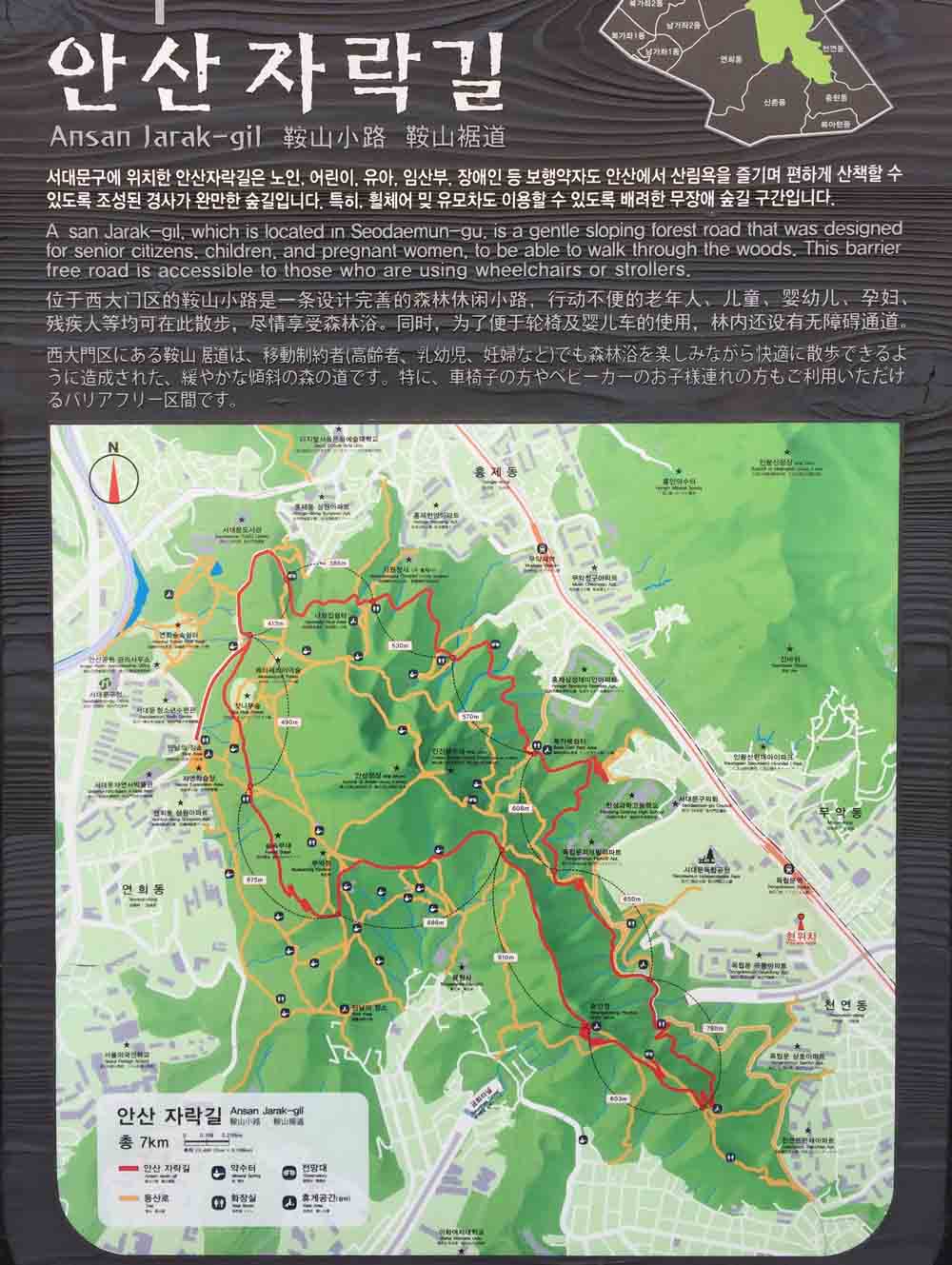 공원에 들어가면 안산 등산로와 자락길 코스가 그려진 전체 지도가 나와있는데 생각보다 길었다. 총 7km 소요시간은 2시간 30분쯤이라고 한다. 나중에 낮시간을 이용해서 다시 오려고 지도를 크게 찍어뒀다.