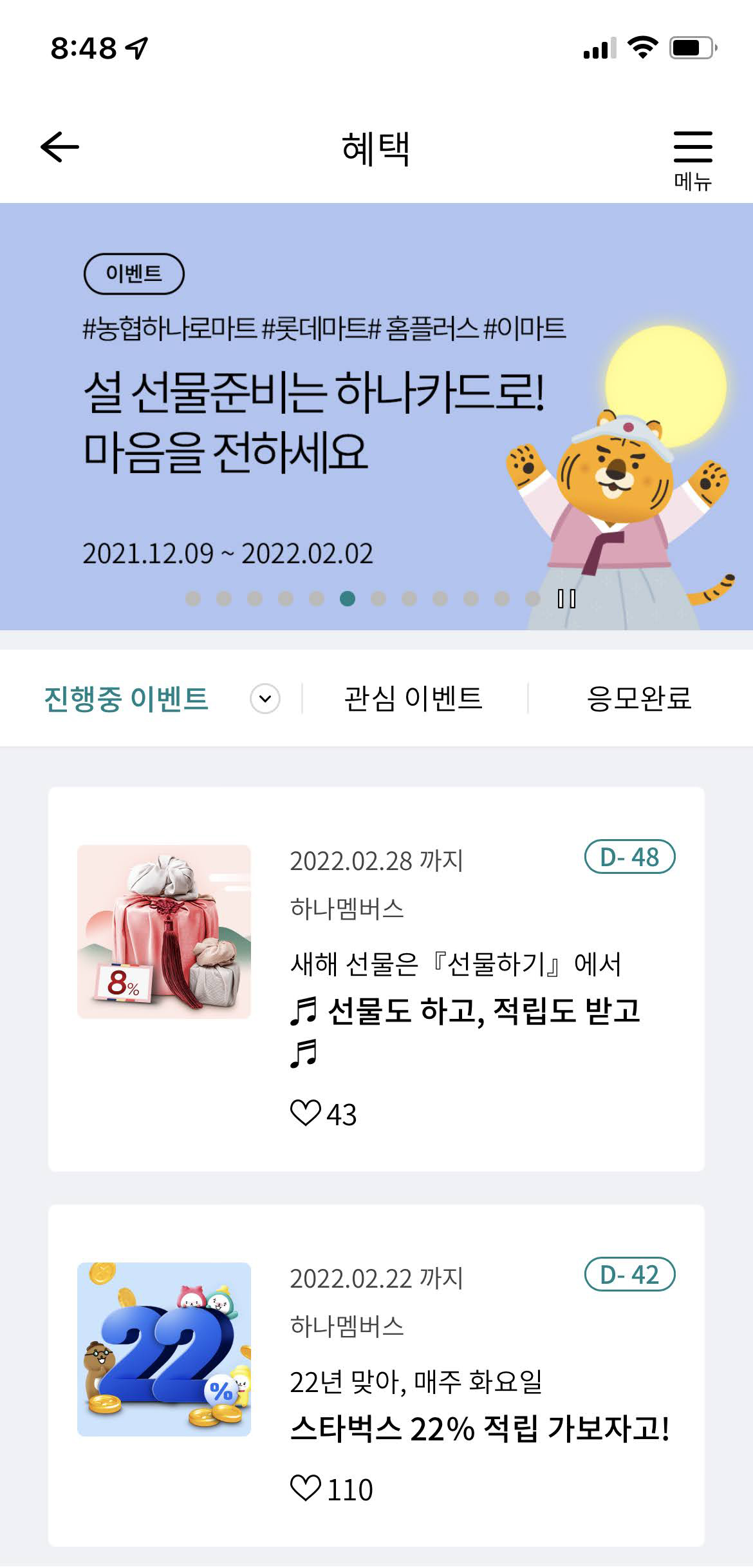 바로 어제 시작한 하나 멤버스 <선물하기 신년이벤트> 입니다. 2022년을 맞아 매주 화요일에 스타벅스 기프티콘을 구매 시, 구매금액의 22%를 적립해준다고 합니다. (이 페이지는 하나멤버스 앱 내 이벤트 페이지 입니다.)