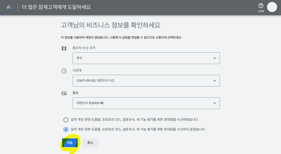 4. 고객님의 비즈니스 정보를 확인하세요. 여기는 자동으로 설정되어진 내용을 확인하고 초대장 수신 여부를 선택 후 제출을 눌러주시면 되겠습니다.