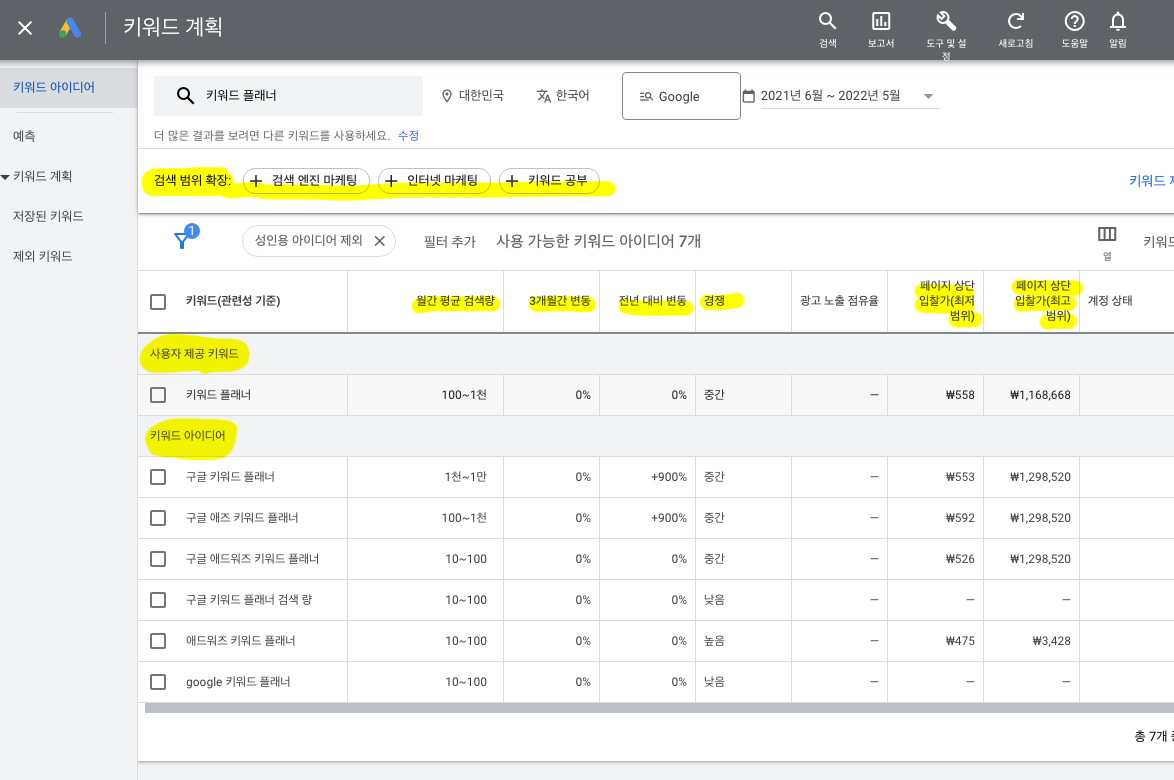 N잡, 월급 외 부수입, 머니 파이프라인 만들기.. 등등의 이유로 SNS를 많이 이용하는데요. 인스타나 유튜버에 비하면 블로그는 수익성이 낮다고 볼 수도 있겠으나 비교적 쉽게 접근할 수 있고 내용에 따라 하나의 포스팅이 시간이 지나도 꾸준히 노출되는 지속성이 높다는 장점이 있습니다. 그런 똘똘한 포스팅 하나하나가 쌓이면 수익도 덩달아 좋아지겠죠. 그럼 그런 똘똘한 포스팅은 어떻게 쓸 수 있을까요? 노출도 잘 되고, 수익도 높고, 경쟁력 있는 포스팅을 하기 위해서는 키워드 설정이 제일 중요해요. 물론 내용도 알차야겠지만 같은 내용이라고 가정한다면 단어 한 끗 차이로 결과는 크게 달라질 수 있거든요. 그냥 글을 쓰기보다는 사전에 경쟁력 있는 키워드를 분석한 다음 글쓰기를 한다면 훨씬 유의미한 결과를 이끌어 낼 수 있습니다. 그럼 경쟁력 있는.. 한마디로 수익이 높은 키워드는 어떻게 찾을까요? 바로 구글 애즈 키워드 플래너에서 찾을 수 있습니다. 키워드의 단가를 찾아줄 뿐만 아니라 관련키워드 아이디어까지 주는 구글 애즈 키워드 플래너! 지금부터 키워드 플래너를 어떻게 사용하는지 알려드릴게요.