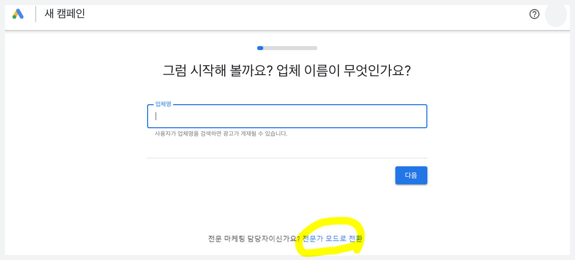2. 업체 이름이 무엇인가요? .. 당황하지 않고 아래 작은 글씨 전문가 모드로 전환 글씨를 클릭합니다.