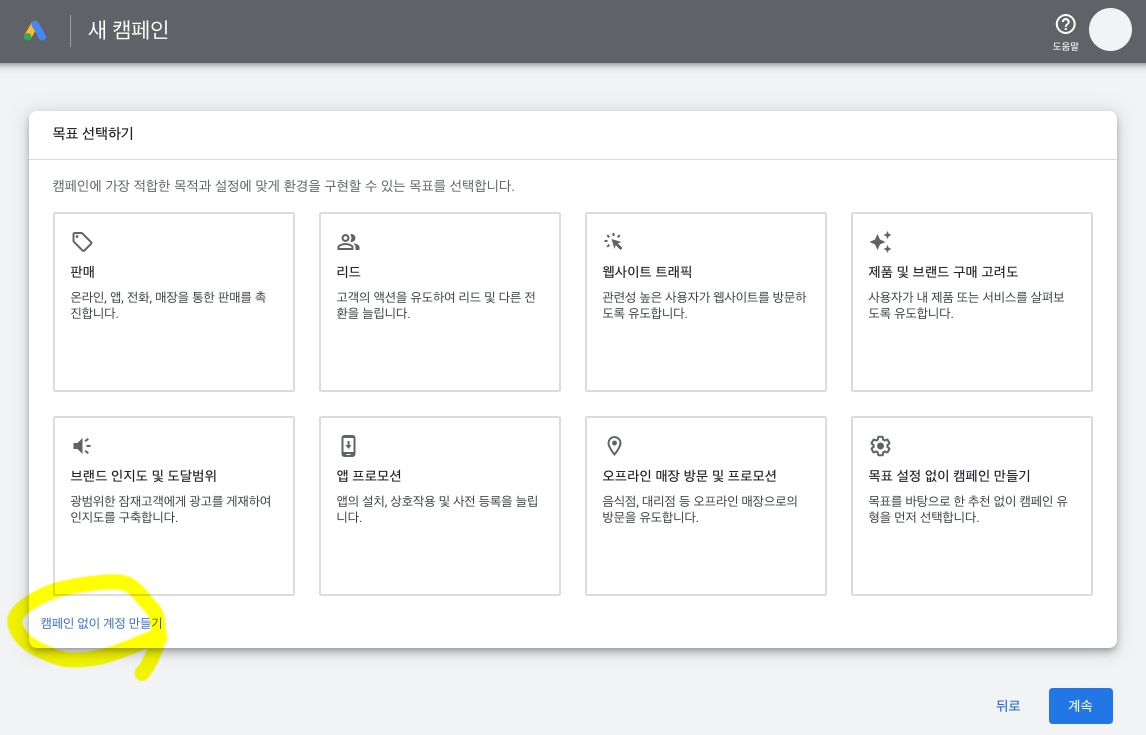 3. 다음페이지는 더 당황스럽습니다. 캠페인? 목표? 이런 걸 선택하라고 나와요. 하지만 역시 당황하지 않고 왼쪽 아래 작은 글씨로 캠페인 없이 계정 만들기를 클릭합니다.