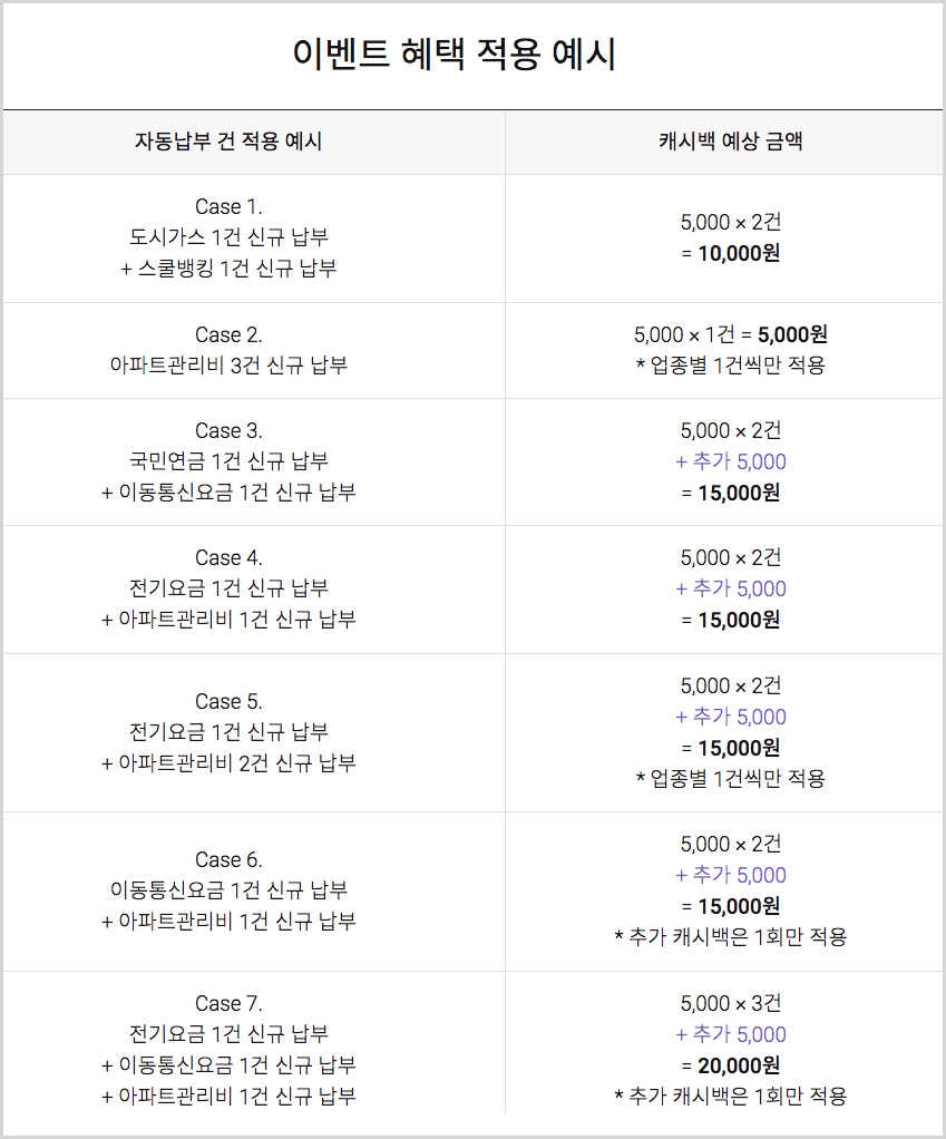 혜택 2 _아파트 관리비 or 이동통신요금을 포함하여 2건 이상 혜택 적용 시에는 5,000원을 추가로 캐시백 해드림(혜택 2번의 이벤트 적용 예시는 아래 표를 참고)