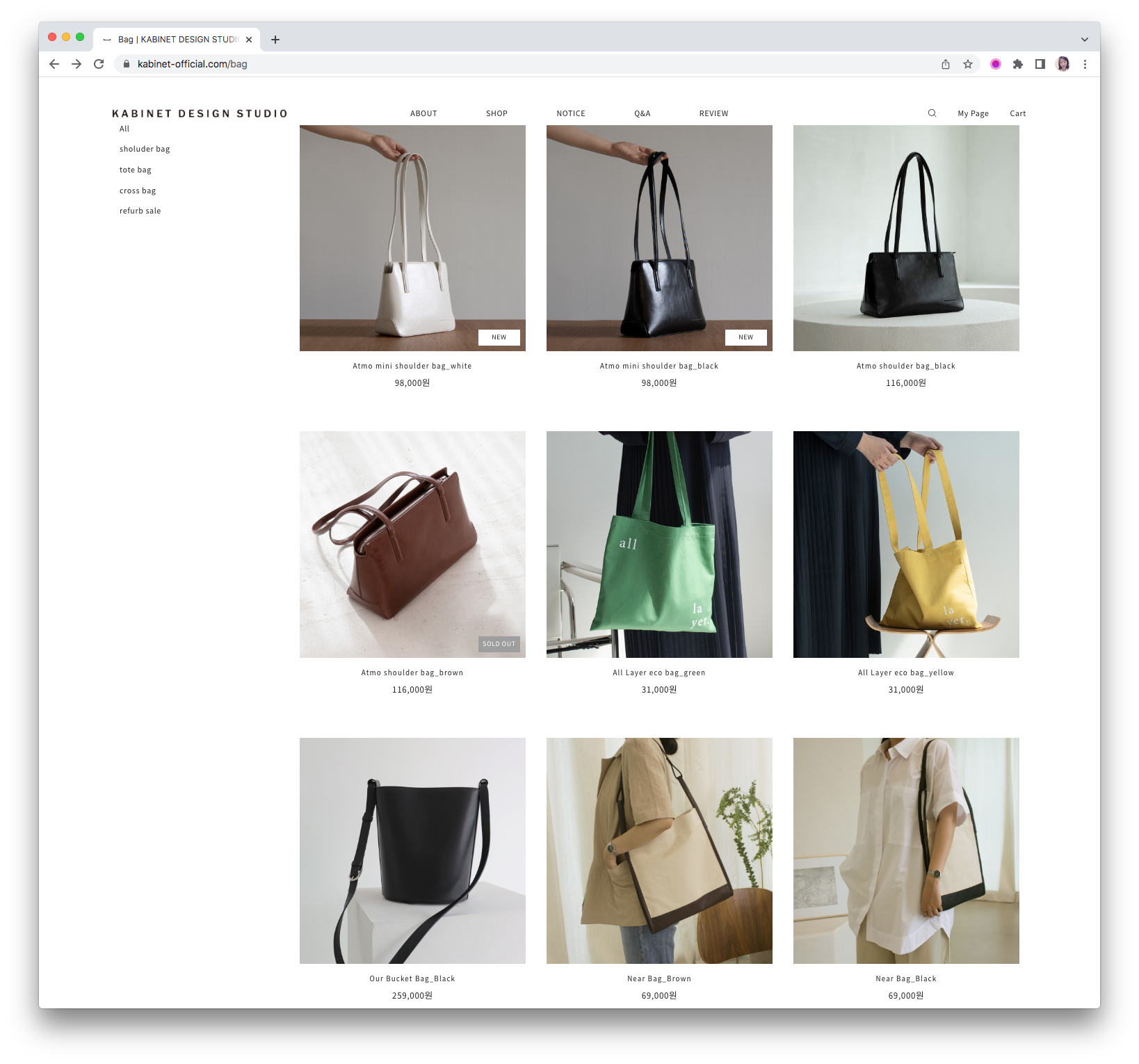 어느날 친구의 인스타그램에 요즘 내가 찾던 디자인의 가방을 들고있는 사진을 봤어요. 어디서 샀는지 궁금하기도 하고 실물을 보고싶어서 만날때 보여달라고했죠. 실물로 보니 역시 마음에 쏙 들더군요. 친구는 29cm라는 편집샵에서 샀다고 했어요. 29센치도 처음 들어서 해매는 저에게 친구는 브랜드 샵 링크를 보내줬죠. 그렇게 캐비닛 디자인 스튜디오라는 브랜드를 알게됐어요.