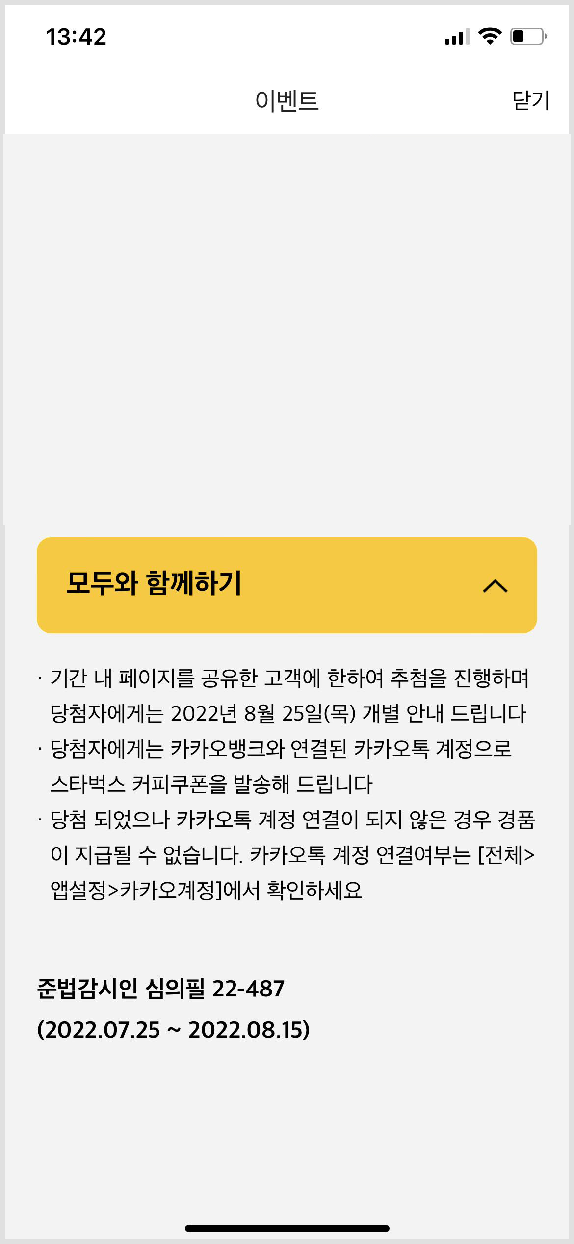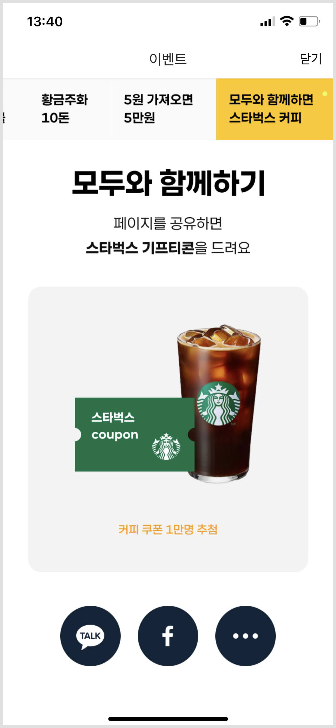 마지막으로 페이지를 공유하면 스타벅스 기프티콘을 드려요. 요즘 말도 많고 탈도 많은 스타벅스 커피 쿠폰이에요. 카카오톡 계정이 연결되어있어야 받을 수 있으니 연결여부는 앱에서 확인하시고 페이지를 공유해보세요~ 저는 연결된 카카오톡으로 페이지를 공유하고 참여 완료했답니다. 위 다섯 가지 이벤트는 중복 추첨이 가능하다고 하니 모두 참여해보세요~