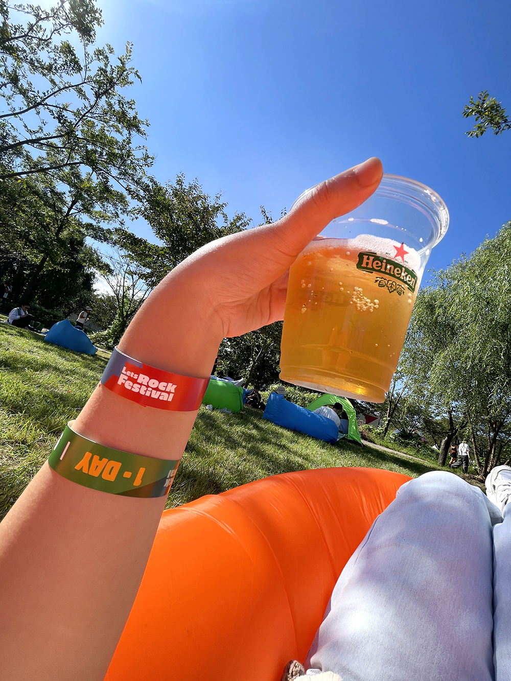 공연을 즐긴후 릴렉스 존에 와서 굴러다니는 공기쿠션(?)을 하나 차지했다. 논알콜 맥주를 즐기면서 선선한 나무 밑에 누워있으니 이보다 더 좋을 수가 없다. 좋다~ 한량이 따로 없네~ 여기 그늘이 너무 시원하고 좋아서 나중에는 돗자리를 아예 이쪽으로 옮겼다. 흡연구역이랑 화장실도 가깝고 여기가 돗자리 명당이었다.