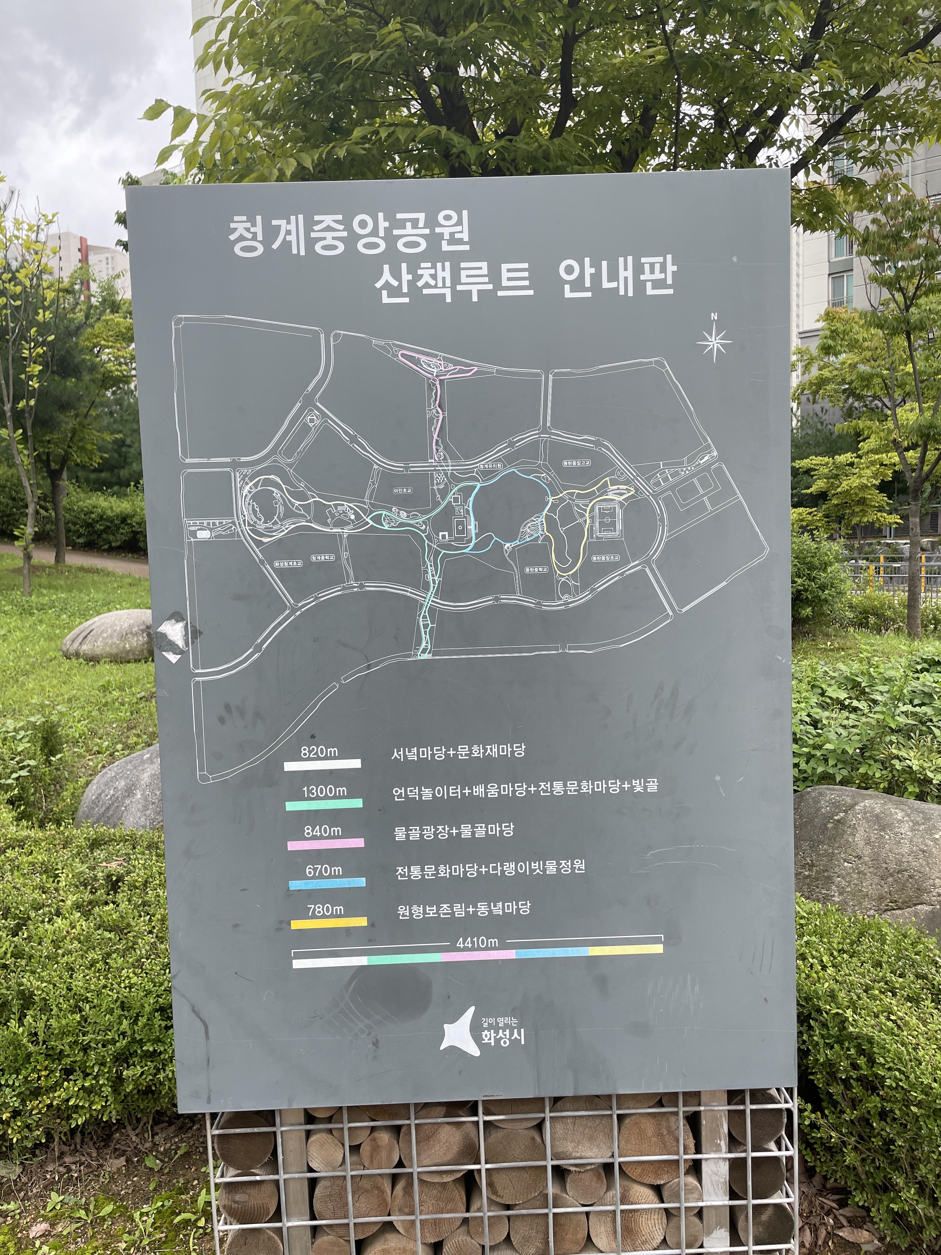 청계중앙공원 산책 루트가 길이별로 자세하게 나와있다. 가장 긴 코스로 언덕놀이터 + 배움마당 +_전통문화마당 + 빛골을 걷는 1300m 코스가 있고, 가장 짧은 코스로는 전통문화마당 + 다랭이 빗물정원을 걷는 670m 코스가 있다.